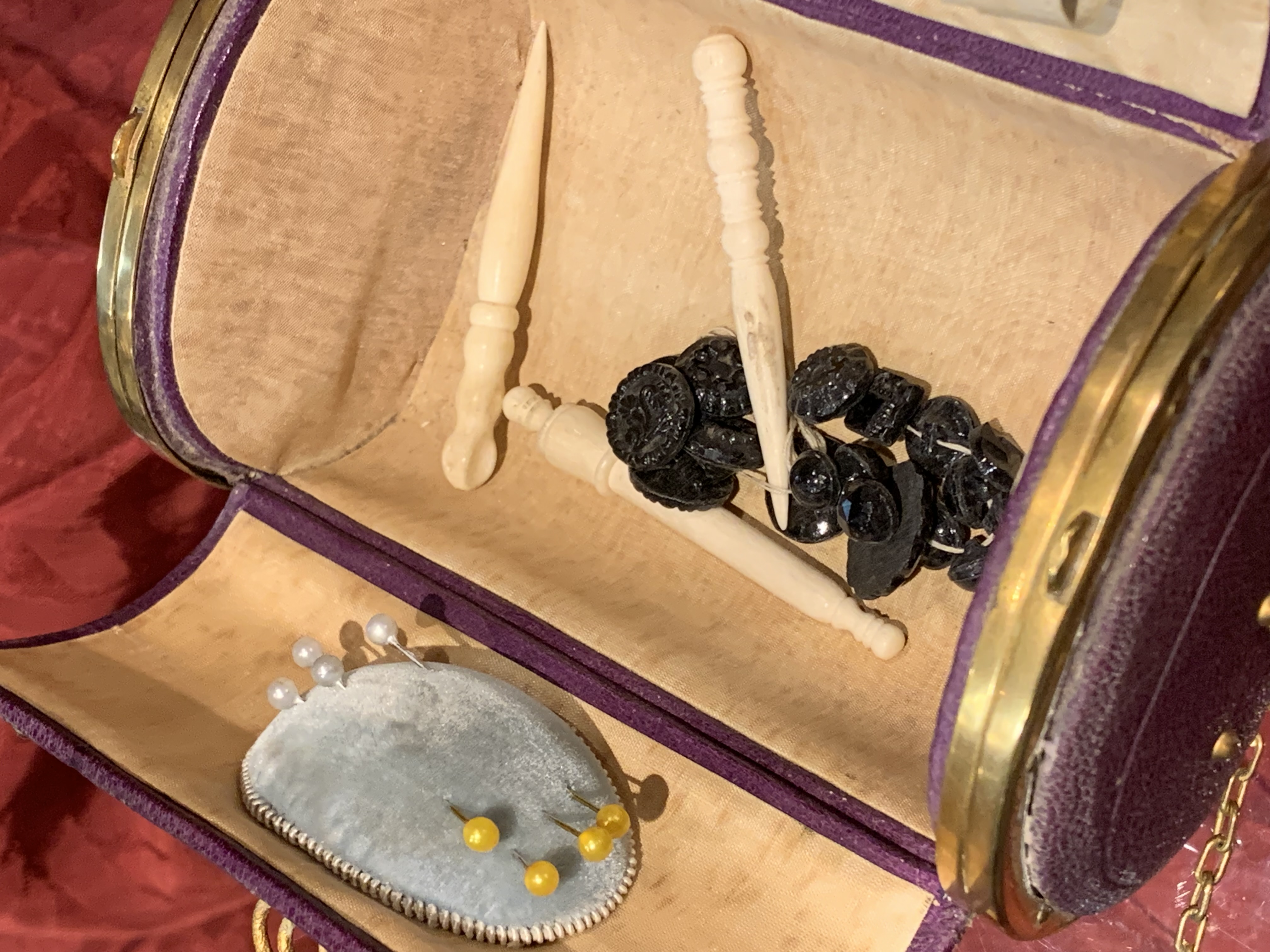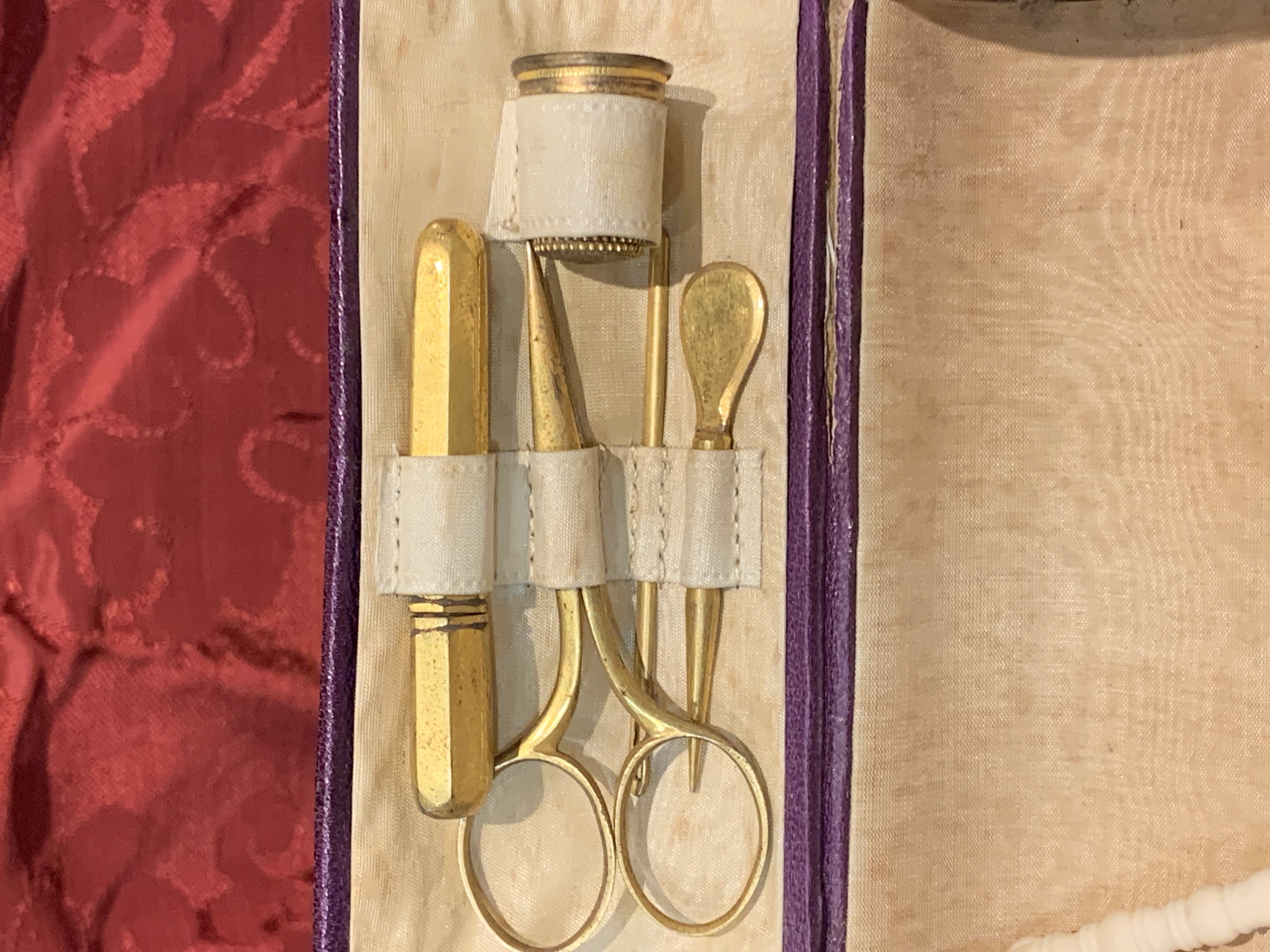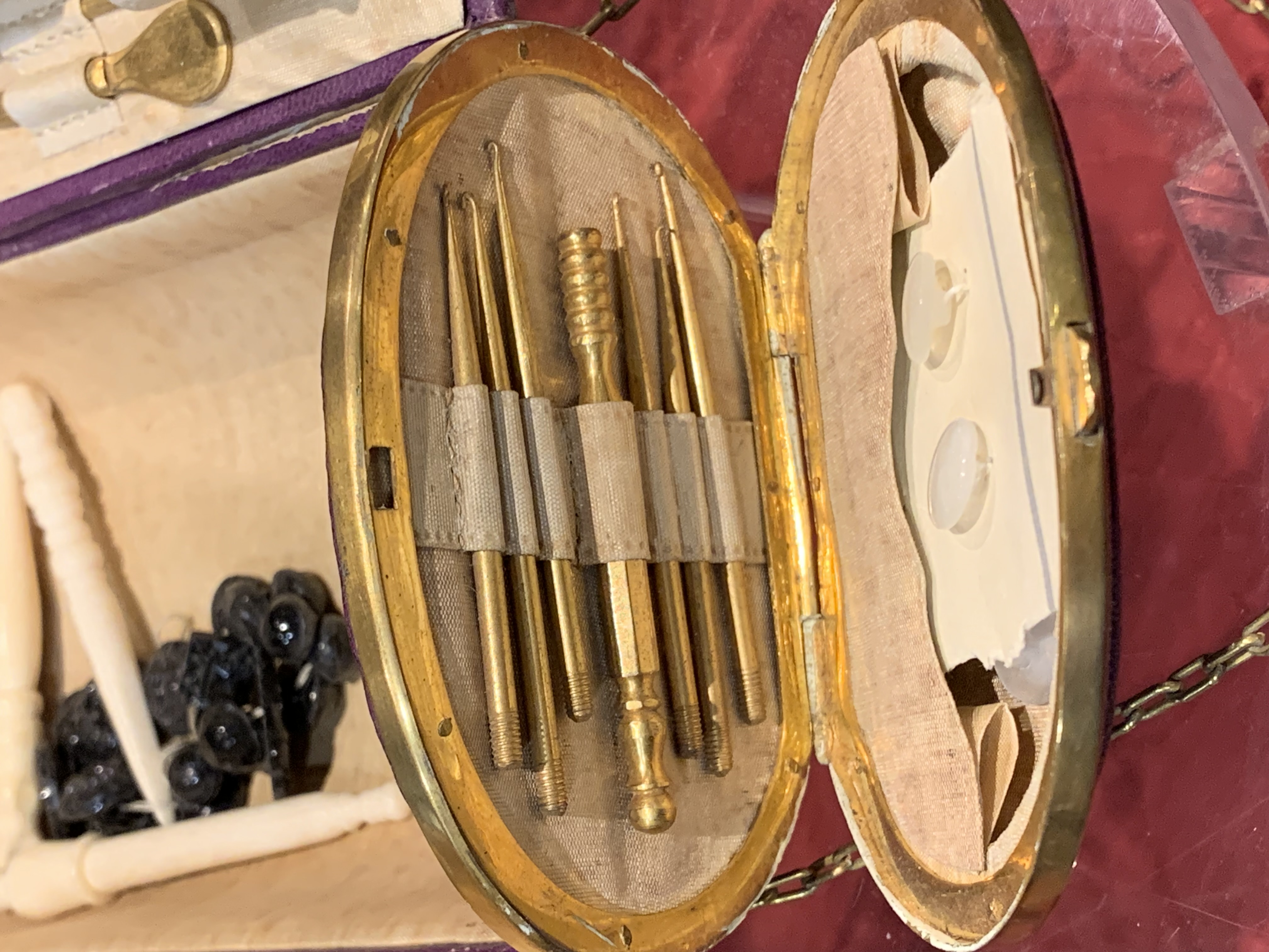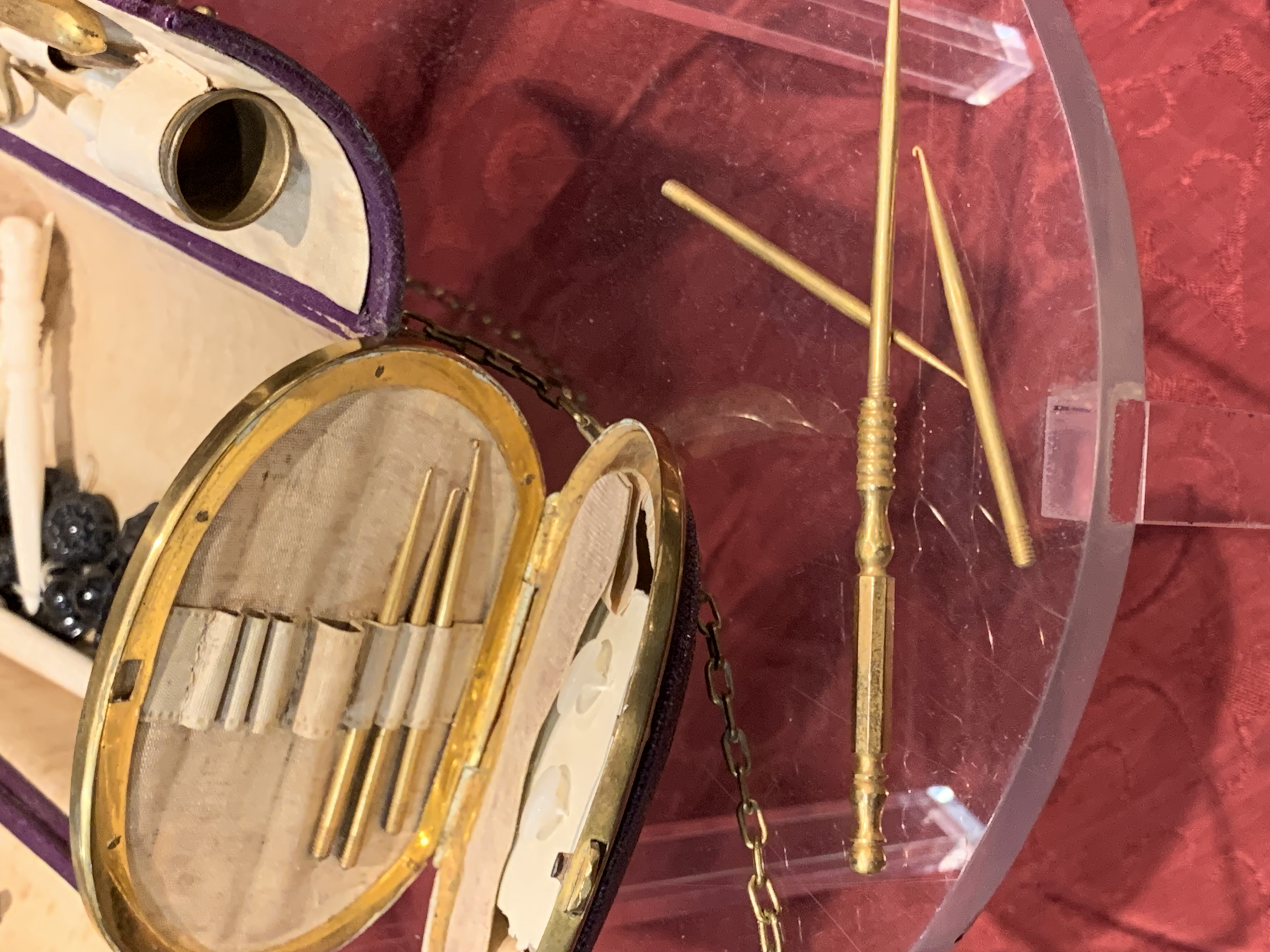 Zona central con piezas de hueso, alfileres etc.., tijeras,aguja, dedal, punzón todas ellas doradas al mercurio.